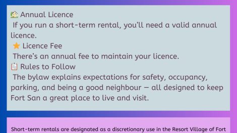 Given the close proximity to the town of Fort Qu’Appelle, the Resort Village is fortunate to have access to the All Nations Healing Hospital, a library, museum, art galleries, as well as a number of businesses, restaurants and lodging accommodations.  Golfing, downhill skiing and year round lake access compliment the Resort Village of Fort San as a year round vacation destination.